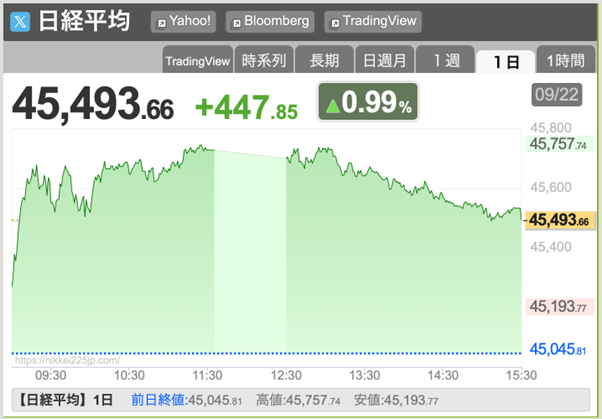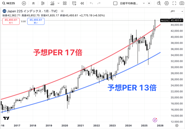 2025年9月時点の筆者の想定レンジは34000〜43000円です。9/22時点、日経終値は45493円です。「だいぶ高いな〜」と思います。