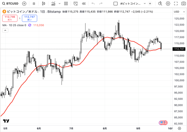 金融相場では、日経平均よりビットコインの方が先に天井を打って、下落トレンドに入って、先に崩れる、みたいな動きになるケースがよくあるんですよね。