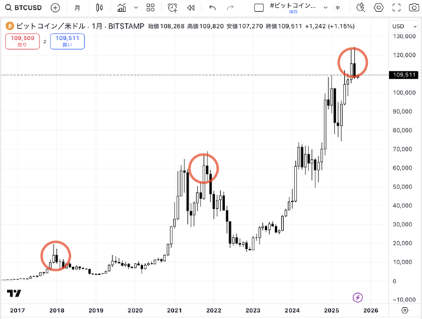 ビットコインって、4年周期でピークつけてるんですよね。ちょうど今が高いところなので、気味がわるいです💦