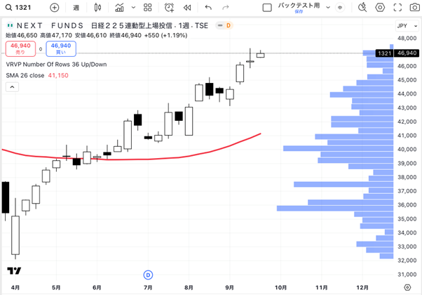 日経平均ETF(1321)の価格帯別出来高を見てみます: