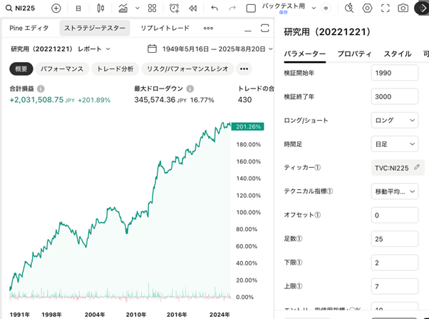 上のグラフが、日経平均株価の25日平均乖離率が-3%〜+2%の時のバックテスト結果です。TOPIXも似た感じの結果になります。