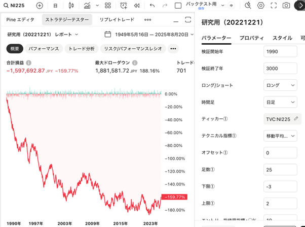 上のグラフが、日経平均株価の25日平均乖離率が+2%〜7%の時のバックテスト結果です。(バックテスト期間は1990年以降)