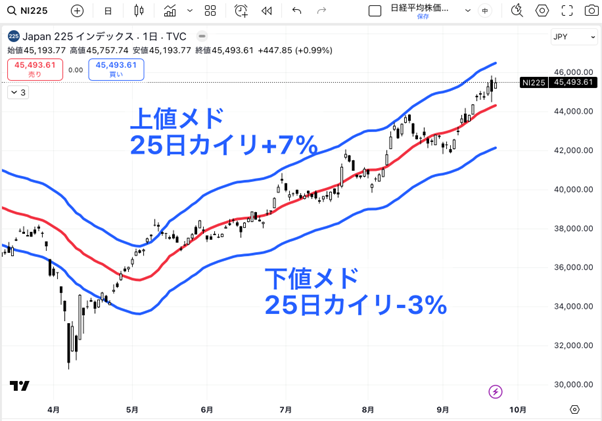 目安としては、25日平均から「+2%〜7%」が適温相場で、そこから崩れて「-3%〜+2%」となると急に弱くなる傾向があります。