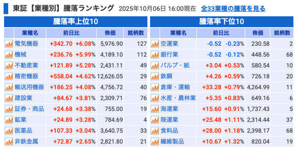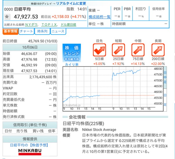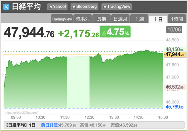 10/6、日経平均は一時48,000円を超えました。前日比は2,175円高。4.75%も上がりました🔥