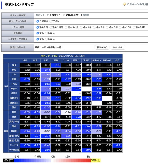 ザラ場中にXでポストしましたが、株式トレンドマップを見てみると、指数は上がっていても、個別株は全然ダメですね。大型株は若干マシですが、日経平均に対して3%ほど劣後しています。