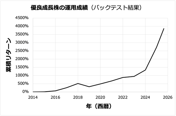 これは、筆者が作った売買ルールのバックテスト結果です。筆者はこの売買ルールを「銘柄選びのチェックリスト」として使っているのですが、おかげさまで今年は好調です。
