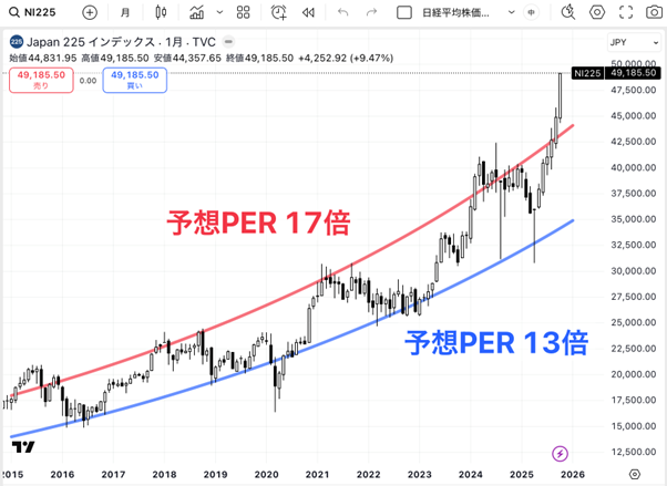 ここ10年ほど、日経平均の予想PERは13〜17倍のレンジで推移しています。