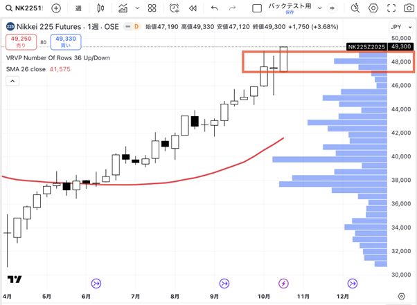先物の価格帯別出来高を見ると、48000円の天井をぶち破り、再び青天井モードに入りました。こうなると、「どこまで上がるか分からないチキンレース」っぽくなってきます。