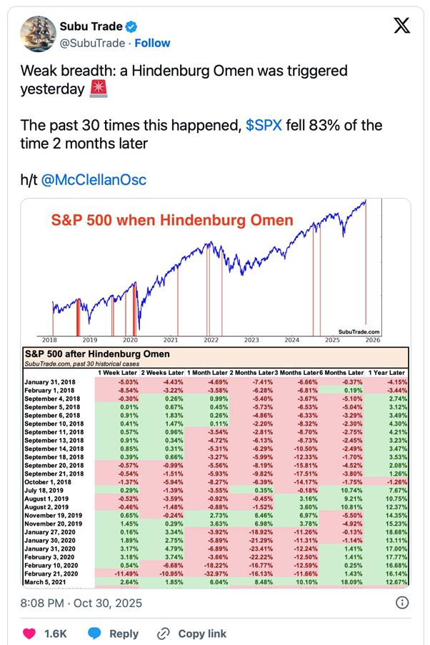 10/29、ふたたびヒンデンブルグ・オーメンという「売り信号」が点灯したそうです。