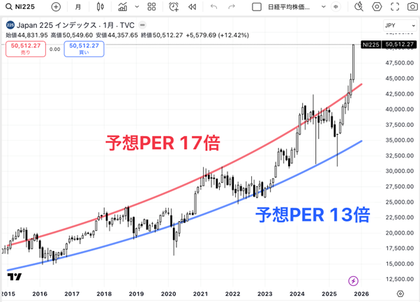 ここ10年ほど、日経平均の予想PERは13〜17倍のレンジで推移しています。