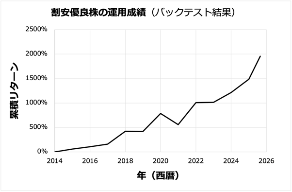 これは、筆者が作った売買ルールのバックテスト結果です。筆者はこの売買ルールを「銘柄選びのチェックリスト」として使っているのですが、おかげさまで今年は好調です。