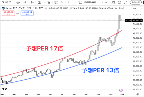 これは、日経平均株価の月足チャートです。見ればわかるように、日経平均は予想PERが13〜17倍のレンジで、上がったり下がったりを繰り返してきました。それが、2025年はピョンと上に抜けてしまいました。