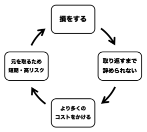 (1)損をしてしまい、(2)引くに引けなくなり、(3)より多くのコストをかけて、(4)コストが高いから元を取るのが難しくなり、無理をして、(1)自滅してまた損をする…この繰り返しです。