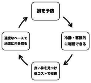 つまり、(1)損を防ぎ、(2)損を防ぐから冷静さを保てて、(3)良い会社に低コストで投資し、(4)低コストだから急ぐ必要もなく地道に利殖でき、(1)損を防ぐから利益が残る…という「正のループ」を目指すわけですね。