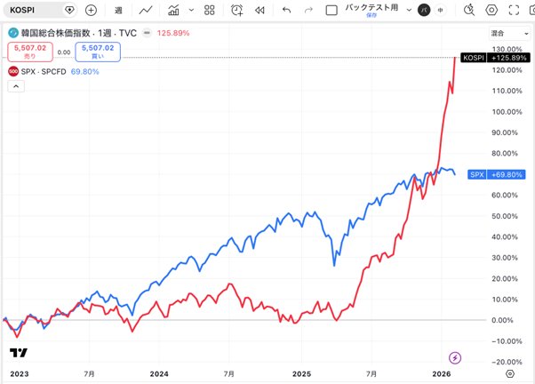 上のグラフは韓国株(KOSPI)と米国株(S&P500)の比較チャートです。